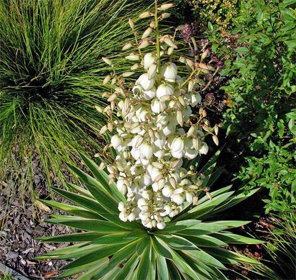 Предыдущая разновидность – не единственная большая юкка, достойная стать своеобразным рекордсменом. Юкка лучистая или высокая вырастает до 1,5–4 метров в высоту, при этом соцветие значительно крупнее, чем у сородичей. Высота цветоноса подчас превышает метр. Цветы, образующие метельчатое соцветие, имеют белую, розоватую или кремовую окраску.
