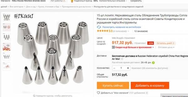 Продается набор насадок для кондитерского мешка на сайте АлиЭкспресс по цене 517 рублей.