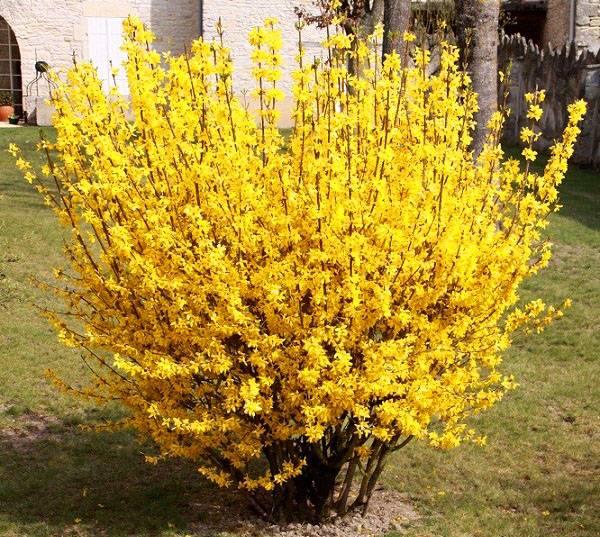 Одним из самых привлекательных подвидов этих кустарников является форзиция средняя Спектабилис. На ее пышных желтых побегах расцветают гигантские бутоны размером примерно 5 см. Куст обычно вырастает до 3,5 м, образуя шикарную крону. Растение активно выращивают на территории Западной Европы. Он чудесно переносит засушливые времена, не теряя при этом своей декоративности. Изображенная на фото форзиция Спектабилис, достоверное подтверждение этого факта.