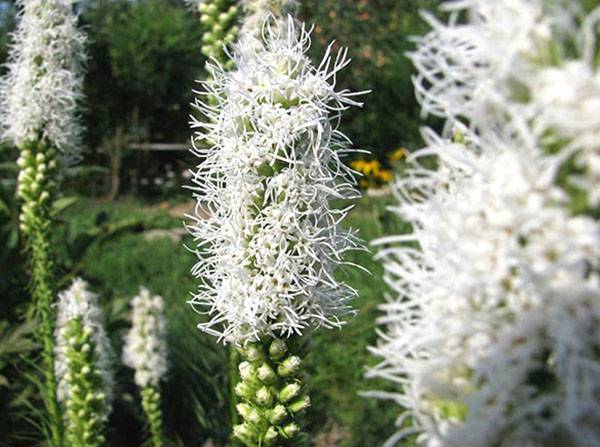 Для сада лиатрис колосковый «Альба» является настоящей «невестой». Когда легкий ветерок начинает тревожить белые утонченные метелки, клумба превращается в шлейф/фату свадебного наряда. Такой белоснежное убранство достойно только актрисы мирового класса. Продолжительность цветения – с конца июня до августа.
