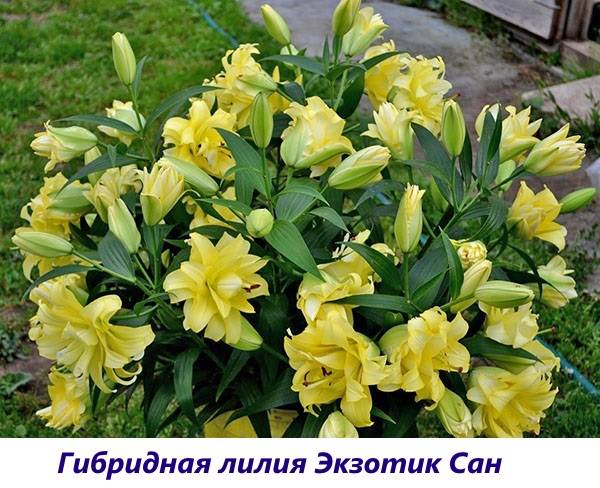 Лилия Экзотик Сан – пример гибрида с полумахровыми цветами. Венчики лимонно-желтой расцветки действительно напоминают яркое солнце над пышной зеленью тропического леса. Диаметр цветка составляет около 20 см, на стебле высотой от 100 до 120 см таких бутонов может быть от 1 до 5.