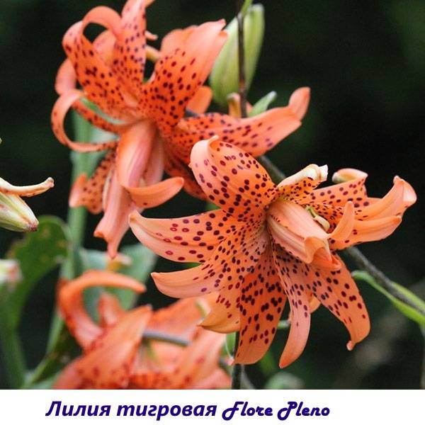 Цветение растений высотой до 120 см начинается во второй половине лета, при этом на стебле может раскрываться до 15 эффектных цветков. Кроме сортов с обычными цветами, сегодня селекционеры предлагают махровые разновидности тигровой лилии, а также ее гибриды с другими родственными формами.